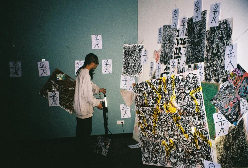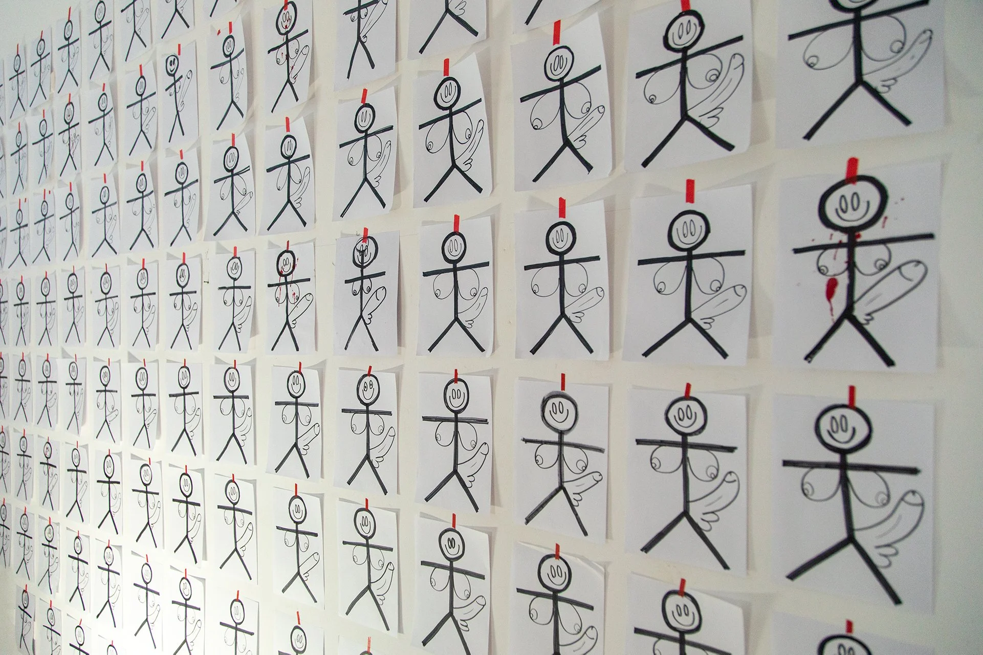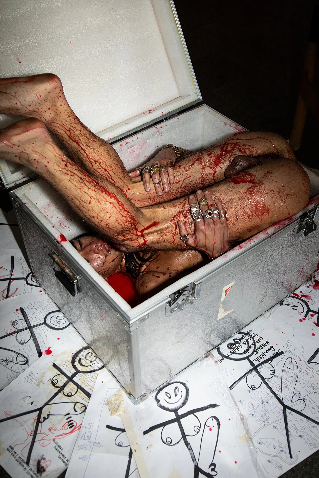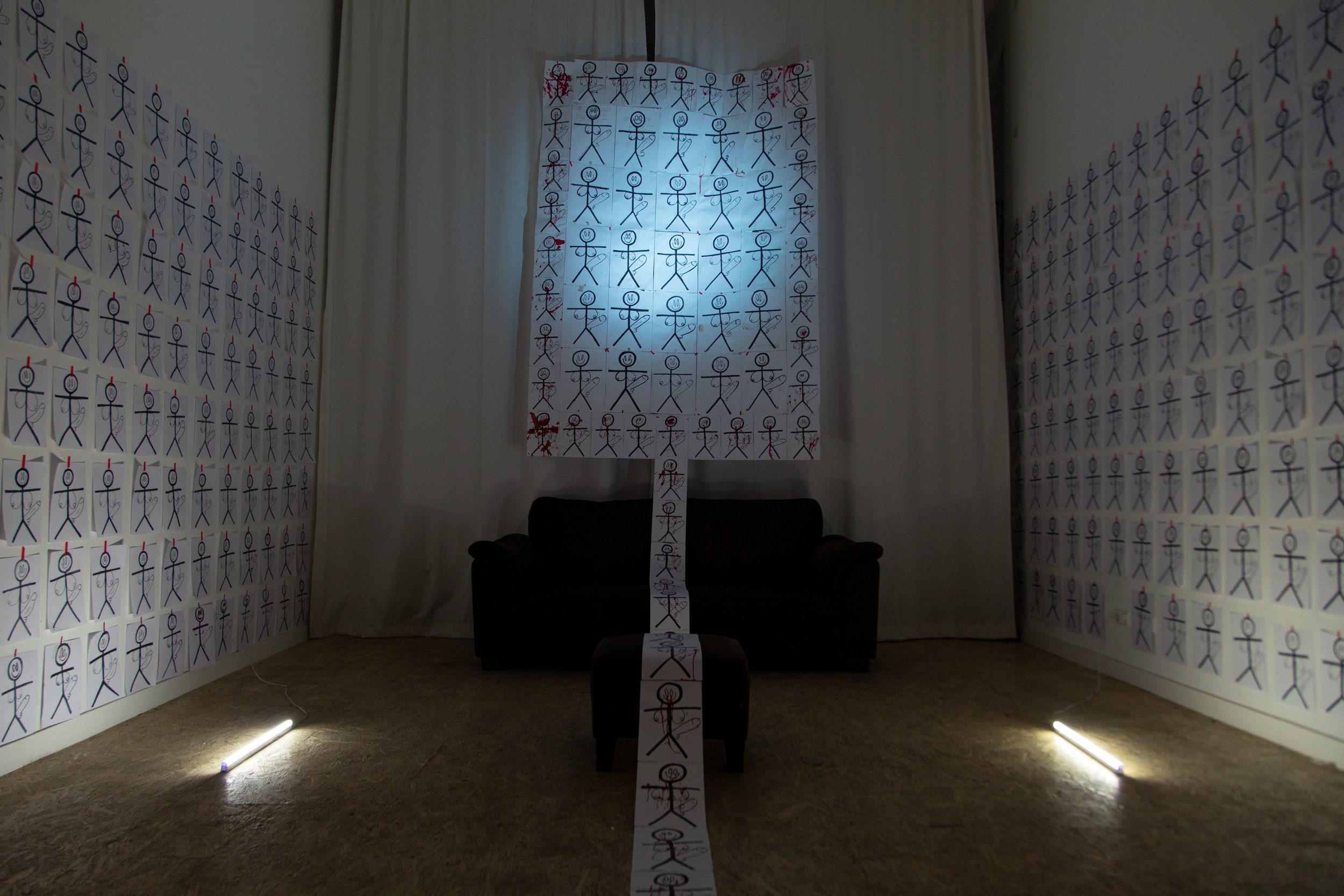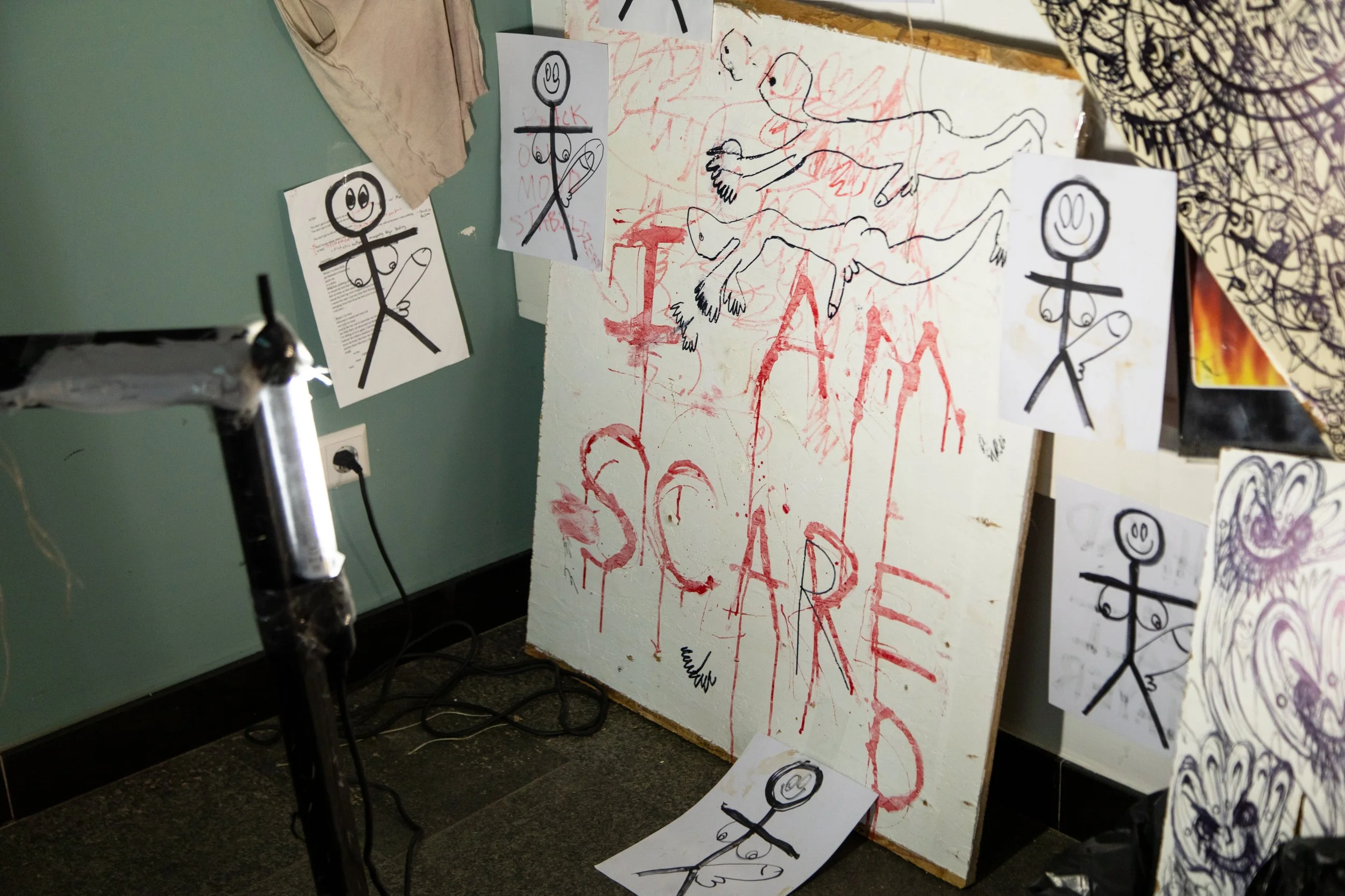 The BUNK-BED BUTT-SEX Collection is a coming-of-age story, the story of catastrophe, of burn-out, of mass-murder and the mass suffocation of queer, creative individuals ... It is the grim satisfaction of a clean sweep into nothingness. The stick figure drawings, with big dicks, big boobs, and big smiles, symbolize a communal loss of innocence, the addictive properties of self-abuse, and the toxic, cyclic simplification of the individual in an effort to perform normality. And for who?? Essentially, this is The Death of a Gifted Child – the gradual disappearance of hope in the eyes of an artist (everyone), and the mental turmoil that comes with knowing one’s potential and having no appropriate outlet for self-expression. In a society that was never built to accommodate originality or imagination, where the commodification of human emotions turns great minds into price tags, being yourself is a truly momentous mission.